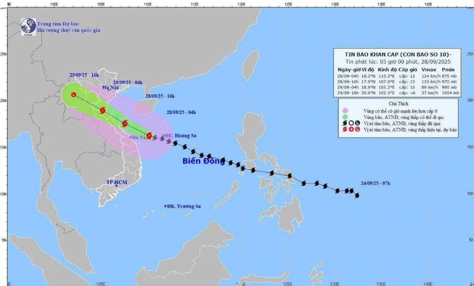 Hồi 4 giờ ngày 28/9, vị trí tâm bão ở vào khoảng 16,2 độ Vĩ Bắc; 110,2 độ Kinh Đông, trên vùng biển phía Tây đặc khu Hoàng Sa, cách Tp. Đà Nẵng khoảng 200km về phía Đông. Sức gió mạnh nhất vùng gần tâm bão mạnh cấp 12 (118-133km/giờ), giật cấp 15. Di chuyển theo hướng Tây Tây Bắc với tốc độ 30km/h. Đây là cơn bão di chuyển rất nhanh (gần gấp đôi tốc độ trung bình), cường độ bão mạnh, phạm vi ảnh hưởng rộng, có thể gây tác động tổng hợp của nhiều loại hình thiên tai như gió mạnh, mưa lớn, lũ, lũ quét, sạt lở đất và ngập lụt ven biển.