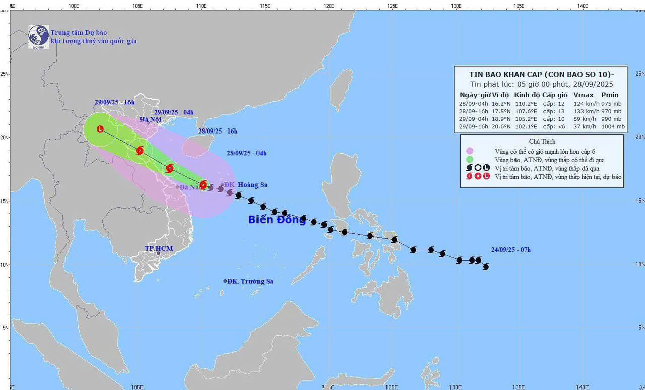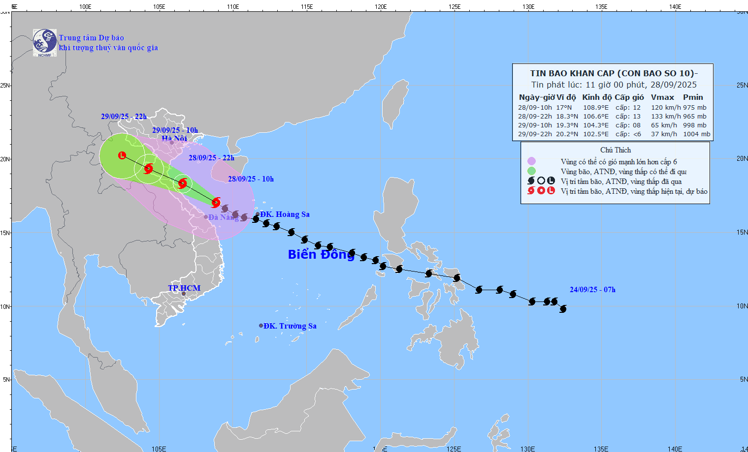 Lúc 10h ngày 28/9, tâm bão số 10 ở trên vùng biển Quảng Trị - Đà Nẵng, sức gió mạnh cấp 12, giật cấp 15. Dự báo trong 12–36 giờ tới, bão tiếp tục gây gió mạnh, sóng lớn, nước biển dâng 0,5–1,5m và mưa to đến rất to tại Bắc Bộ và Bắc Trung Bộ.
