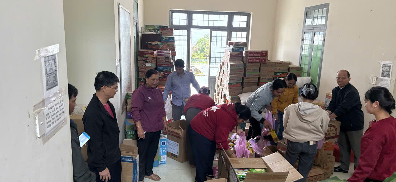 Đồng chí Nguyễn Văn Vĩnh – Phó Bí thư, Chủ tịch UBND xã Đăk Plô chỉ đạo lực lượng cán bộ tổ chức phân loại và đóng gói nhu yếu phẩm hỗ trợ người dân bị ảnh hưởng bởi mưa bão.